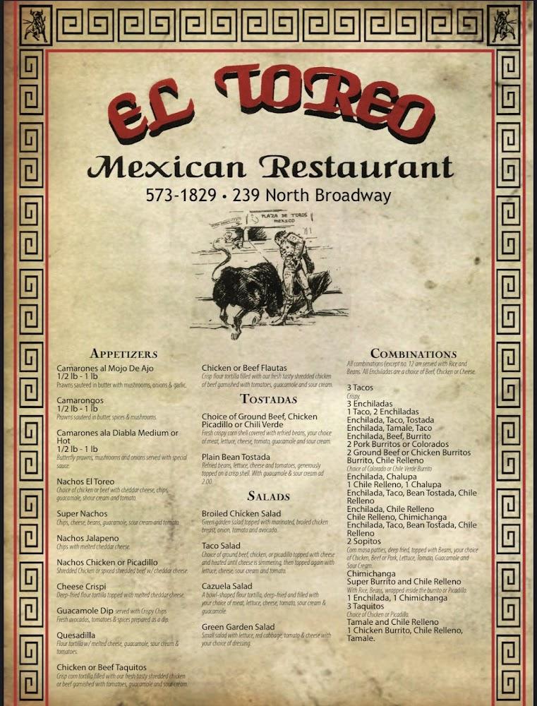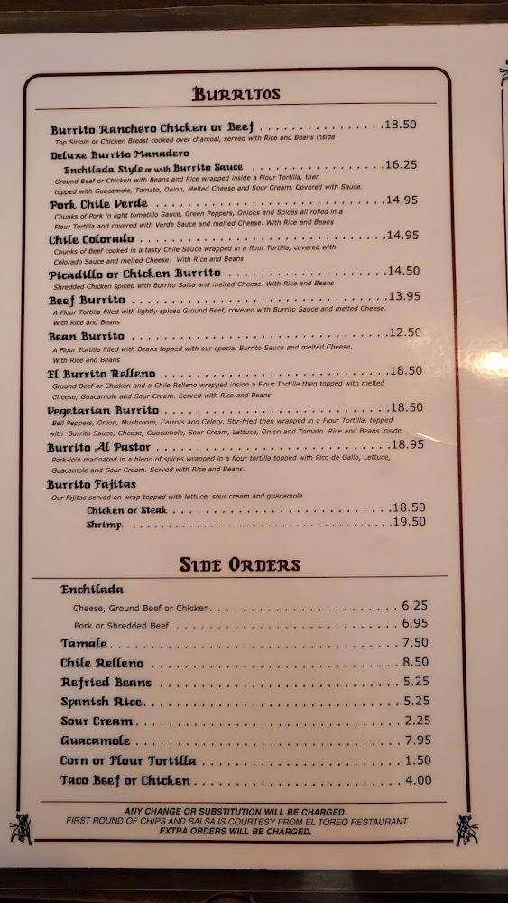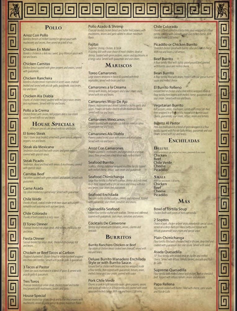 El Toreo’s menu brims with variety, featuring over 125 authentic Mexican dishes. Signature plates include burritos, enchiladas, and carne asada among many others. Each meal incorporates fresh ingredients and traditional recipes.